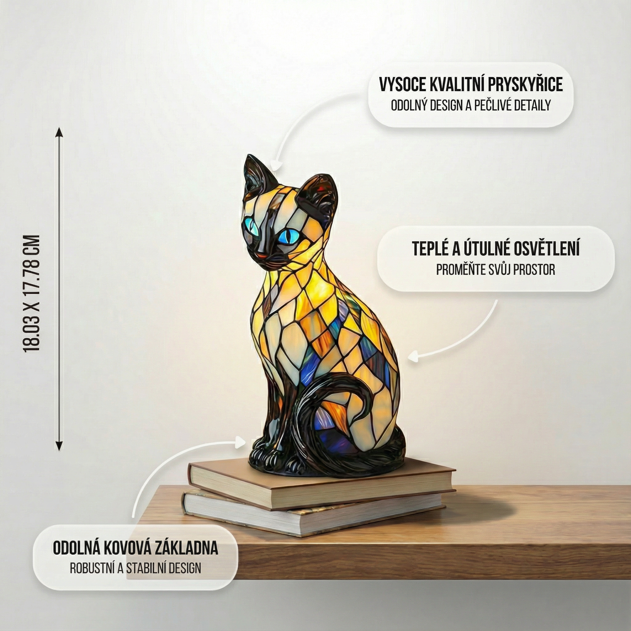 Lampa Mystická kočka je dokonalým doplňkem pro každého, kdo chce oživit svůj prostor. Její design s živými barvami z vitráží vytváří veselou, odvážnou a jedinečnou atmosféru. Lampa vydává jemné a uklidňující světlo, které promění každý kout v elegantní a útulné místo. Její kompaktní rozměry ji dělají ideální pro noční stolky, komody nebo jakýkoli prostor, který potřebuje rozjasnit.